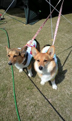 コーギーのこはぎお姉ちゃんのクールダウンTシャツを着てモデル犬してくれました。